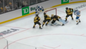 Defenseman Jonathan Aspirot, forward Elias Lindholm, and forward Marat Khusnutdinov are without any opposing bodies leaning on them, allowing forward Dylan Holloway to toss a pass right through the crease. It’s the third period of a big lead, so this kind of stuff happens with any NHL team, but again, the urgency to handle seemingly small situations needs to be there at all times when the five-man unit is defending.
